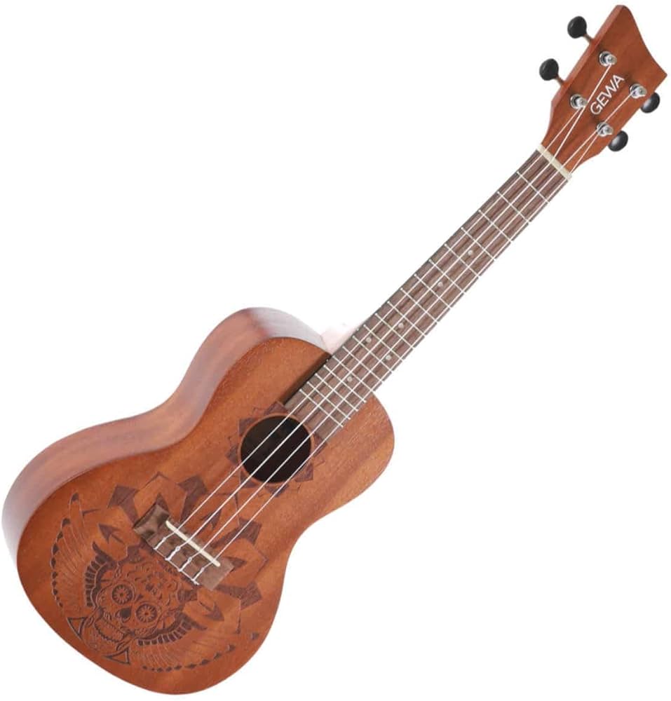 Les gravures sur ce ukulélé sont dignes des meilleurs studios de tatouages! Ukulélé en sapele, bois exotique proche de l’acajou. Le son est agréable et a plus de profondeur que ce que l’on a l’habitude d’entendre dans cette gamme de prix.